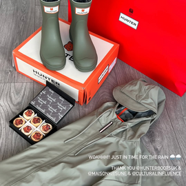 Our Chief Pâtissière Giulia and the Mademoiselle Macaron team set to work creating 20 sets of bespoke luxury macaron boxes. Each sleek black box was finished with an in-house printed sticker of the collection logo - the Maison Kitsuné fox wearing a Hunter cap. Inside, six delicate macarons, three vanilla macarons and three salted caramel macarons, were printed with the logo, bringing together Hunter’s British heritage and Maison Kitsuné’s Parisian playfulness in one perfectly presented treat.
