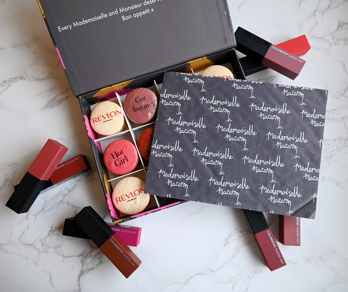 These are available with single, 2 or 3 macarons. Our larger gift boxes (6, 12, 18 and 24 macarons) are branded with the Mademoiselle Macaron logo and swooshes. If you are planning a large event and have a timescale of 2 months plus we can likely assist with branded sleeves for the outside of the boxes at an additional fee.